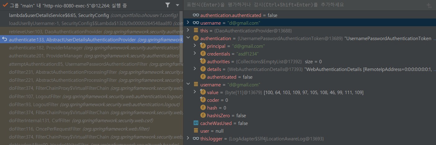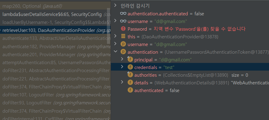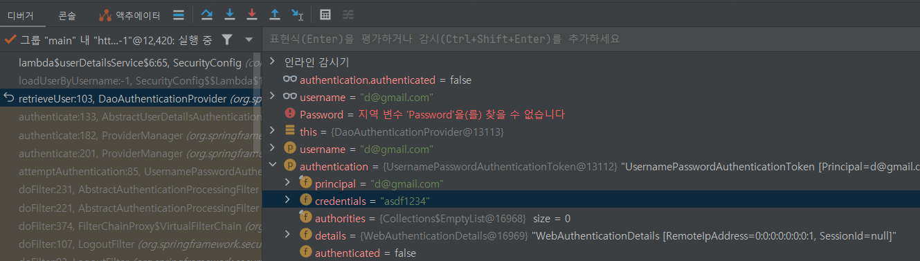 아이디는 맞고 DB에 저장된패스워드와 비밀번호가 저장된 값과 일치하지 않아 인증에 실패했습니다.